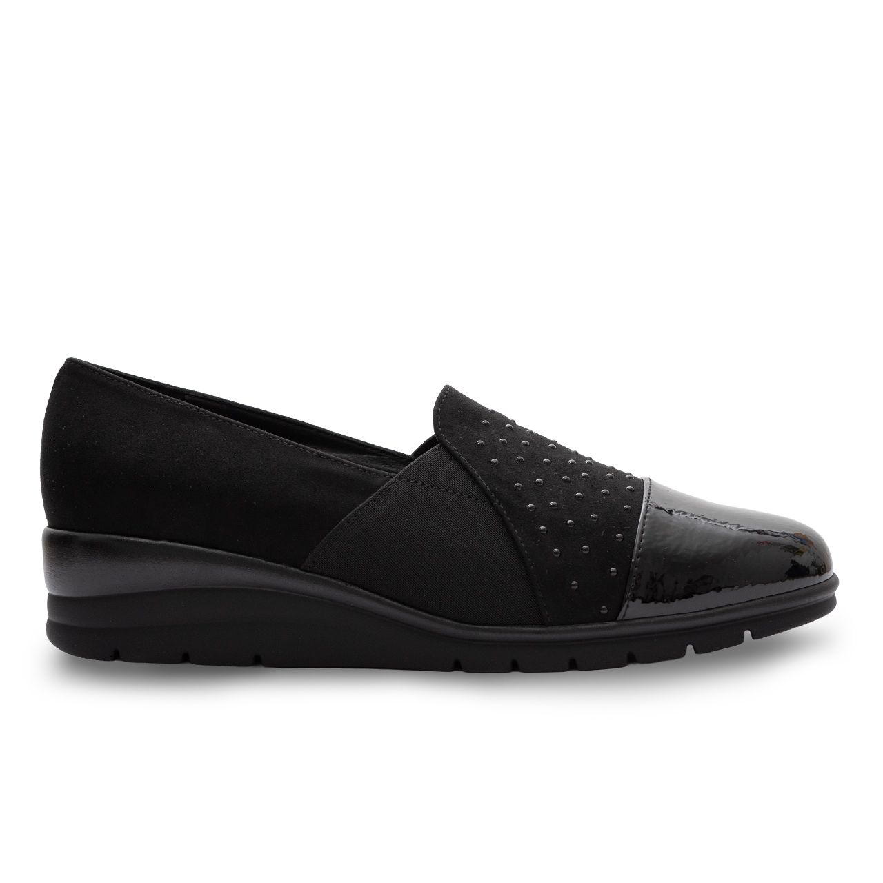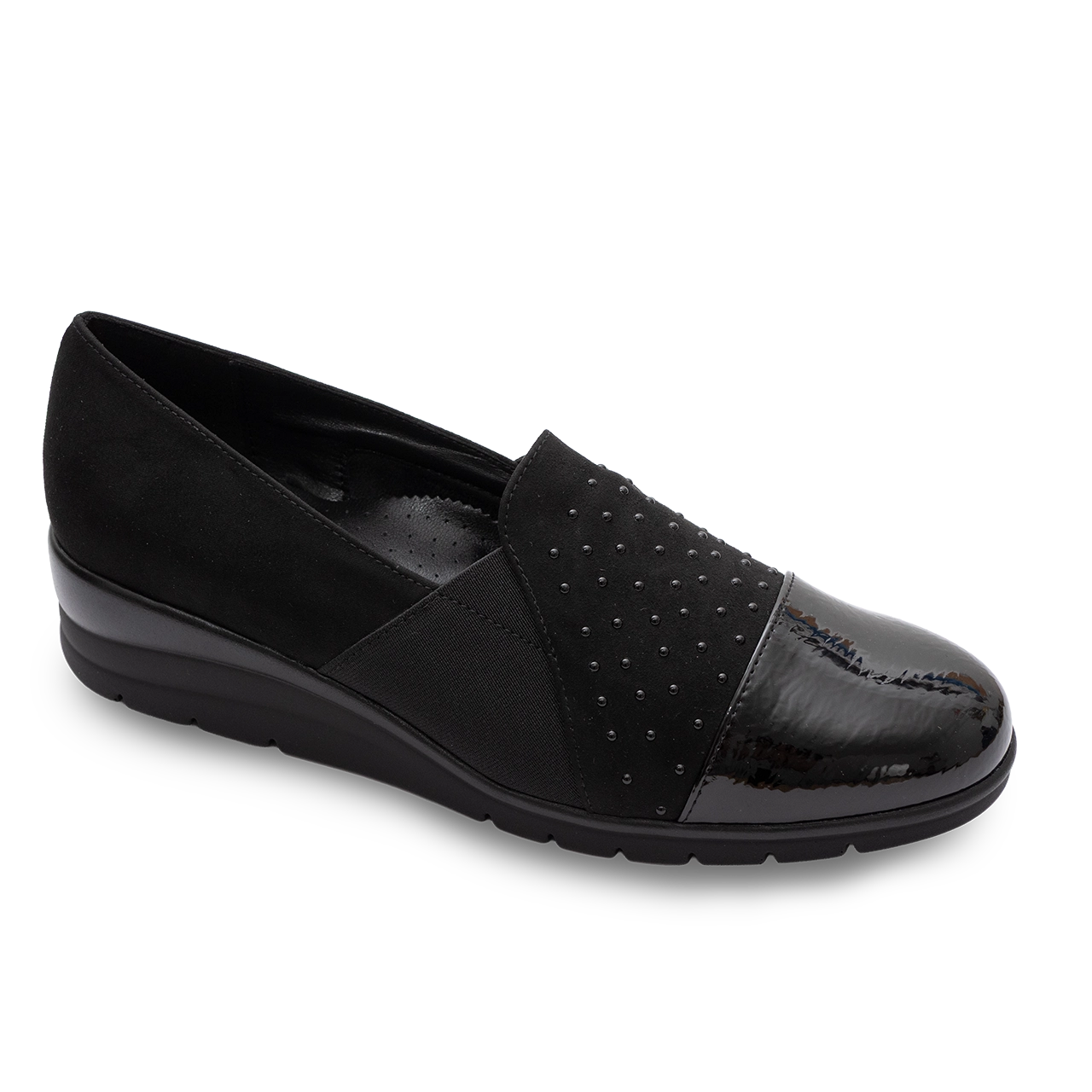 Questo modello slip-on combina raffinatezza e praticità per accompagnarti nelle giornate più dinamiche. Realizzato in morbido eco camoscio nero con dettagli in naplak lucido e piccole borchie, offre un look moderno e versatile. La fodera in ecopelle con maglina in tessuto garantisce una sensazione di morbidezza, mentre la suola flessibile e antiscivolo con altezza di 40 mm assicura stabilità e leggerezza. Il sottopiede in memory foam e la soletta in vera pelle regalano un comfort eccezionale, ideale per chi desidera una calzatura elegante ma perfetta per un utilizzo prolungato. Un modello perfetto per chi cerca una scarpa pratica e sofisticata, con il massimo del comfort ad ogni passo.