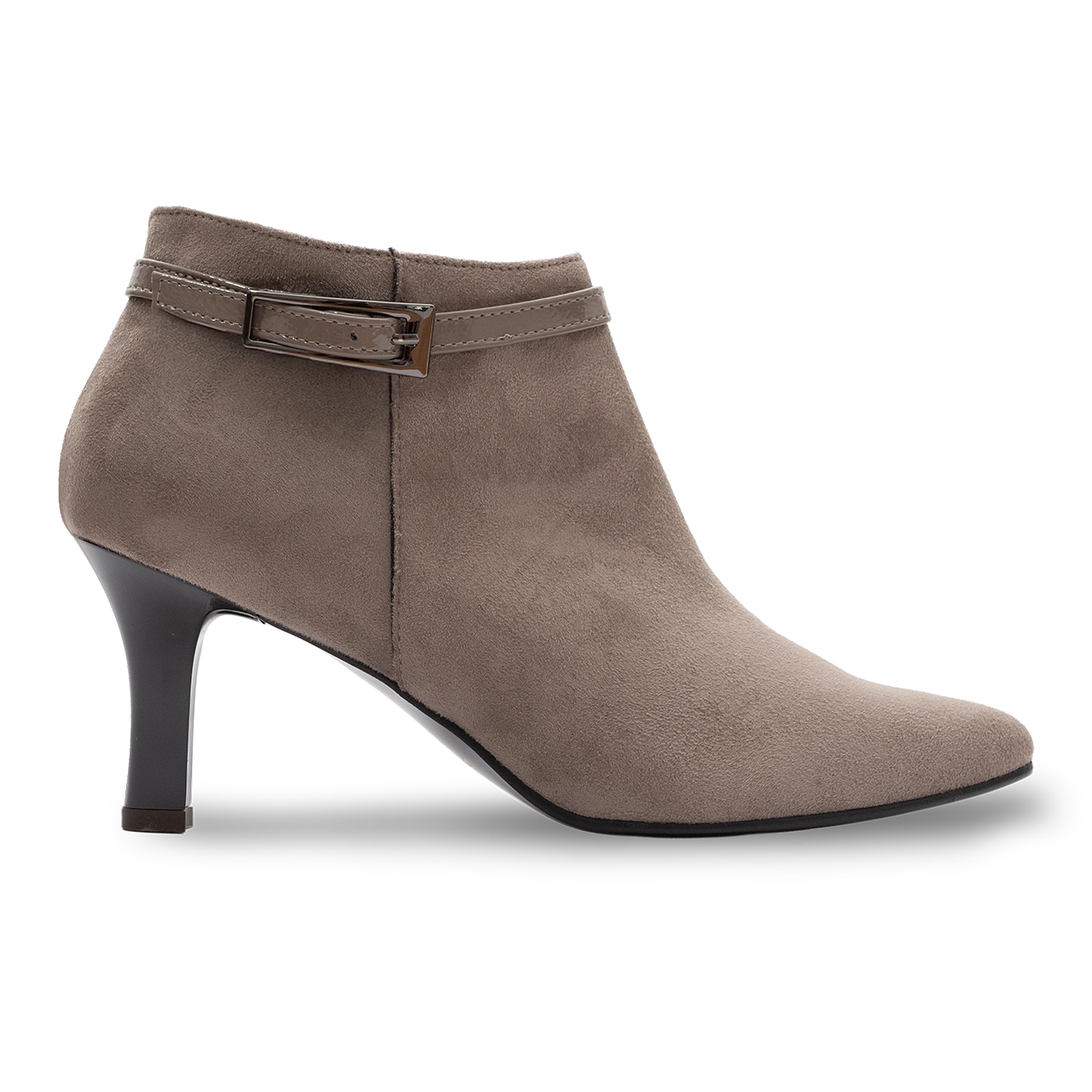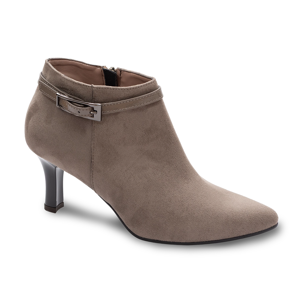 La tomaia in camoscio sintetico taupe, morbida e vellutata, accoglie il piede con delicatezza. Il cinturino in vernice lucida con fibbia decorativa dona un tocco di luce e carattere, rendendo ogni look ricercato e contemporaneo.