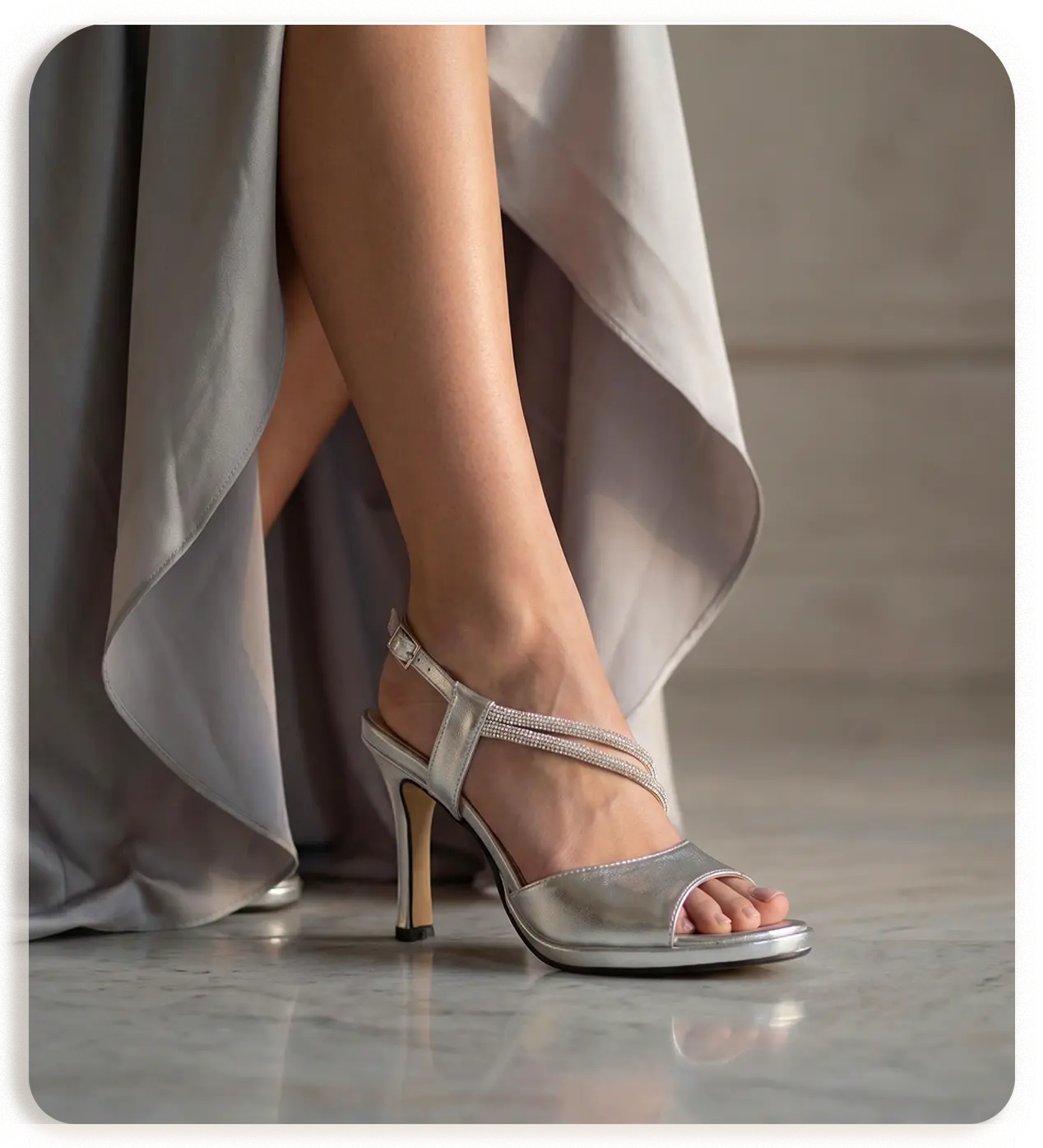 Aurelia (Art. 630) è l’apice della scarpa artigianale Made in Italy. Realizzato in un luminoso laminato argento e impreziosito da un inserto tubolare in strass, questo sandalo gioiello non rinuncia al benessere grazie all’interno in vera pelle e al plantare in memory foam. Il tacco da 9 cm con plateau offre uno slancio regale, rendendola ideale per cerimonie e serate di gala. Disponibile anche in platino e cipria, totalmente personalizzabile.