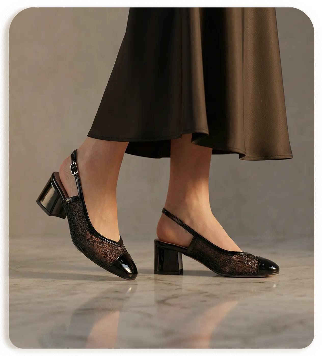 La linea grafica pulita di questa calzatura è esaltata dal contrasto materico tra il pizzo ricamato e la vernice nera della punta e dei profili. La struttura slingback è studiata per essere contenitiva, offrendo una stabilità superiore rispetto ai modelli tradizionali, mentre il tacco medio da 5 cm permette di mantenere una postura elegante senza affaticare il piede.